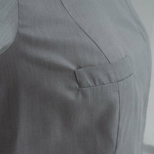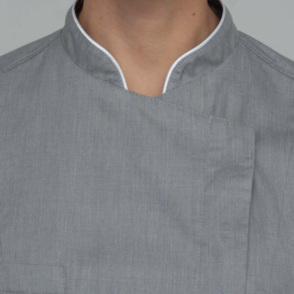 La casacca è disponibile nelle tonalità melange, beige-melange e nero, valorizzate da contrasti di colore nei dettagli. Il collo alla coreana è infatti bordato da un piping a contrasto che si ripete nelle maniche e valorizza la linea del capo. L’abbottonatura ha una paramontatura larga con automatici nascosti, mentre la chiusura è rinforzata da un’impuntura a piedino di 4 cm. La casacca è dotata di una comoda tasca sul lato destro e di un taschino sul petto.