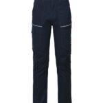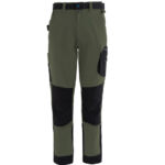 Pantalone da lavoro multitasca e multistagione in cotone twill elasticizzato, con elastici laterali e passanti in vita, chiusura con zip e bottone.