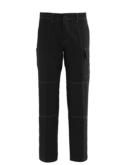 Pantalone da lavoro in cotone leggero ed antistrappo, con passanti in vita ed elastico posteriore, chiusura alla patta con cerniera e bottone scoperto, due tasche anteriori, una tasca posteriore applicata a destra chiusa con bottone, un porta metro applicato su gamba destra, un portapenne e un tascone laterale chiuso con aletta e velcro applicati sulla gamba sinistra, cuciture di colore a contrasto.