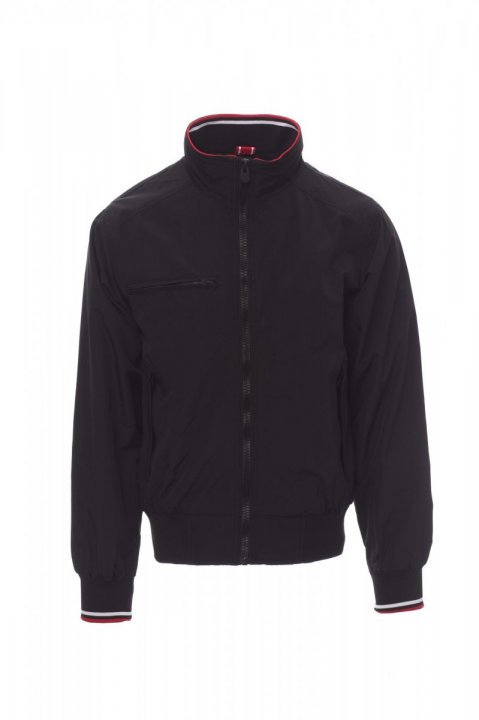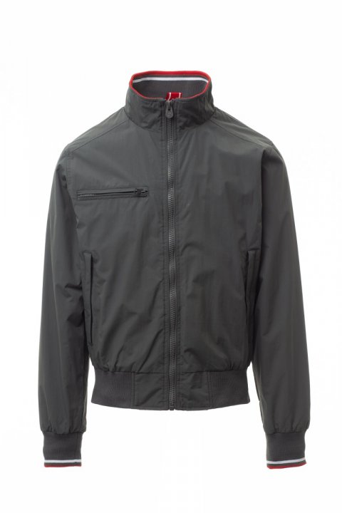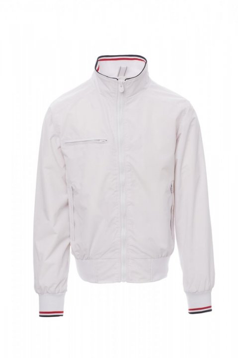 Giubbotto da uomo, zip da 8mm, in plastica con cursore in metallo, con colletto, polsini e vita in rib elasticizzato con righe, due tasche esterne con zip in plastica. Interno non imbottito, retinato, una tasca con cerniera porta smartphone con predisposizione per cavo, zip al petto e schiena per agevolare stampe e ricami.